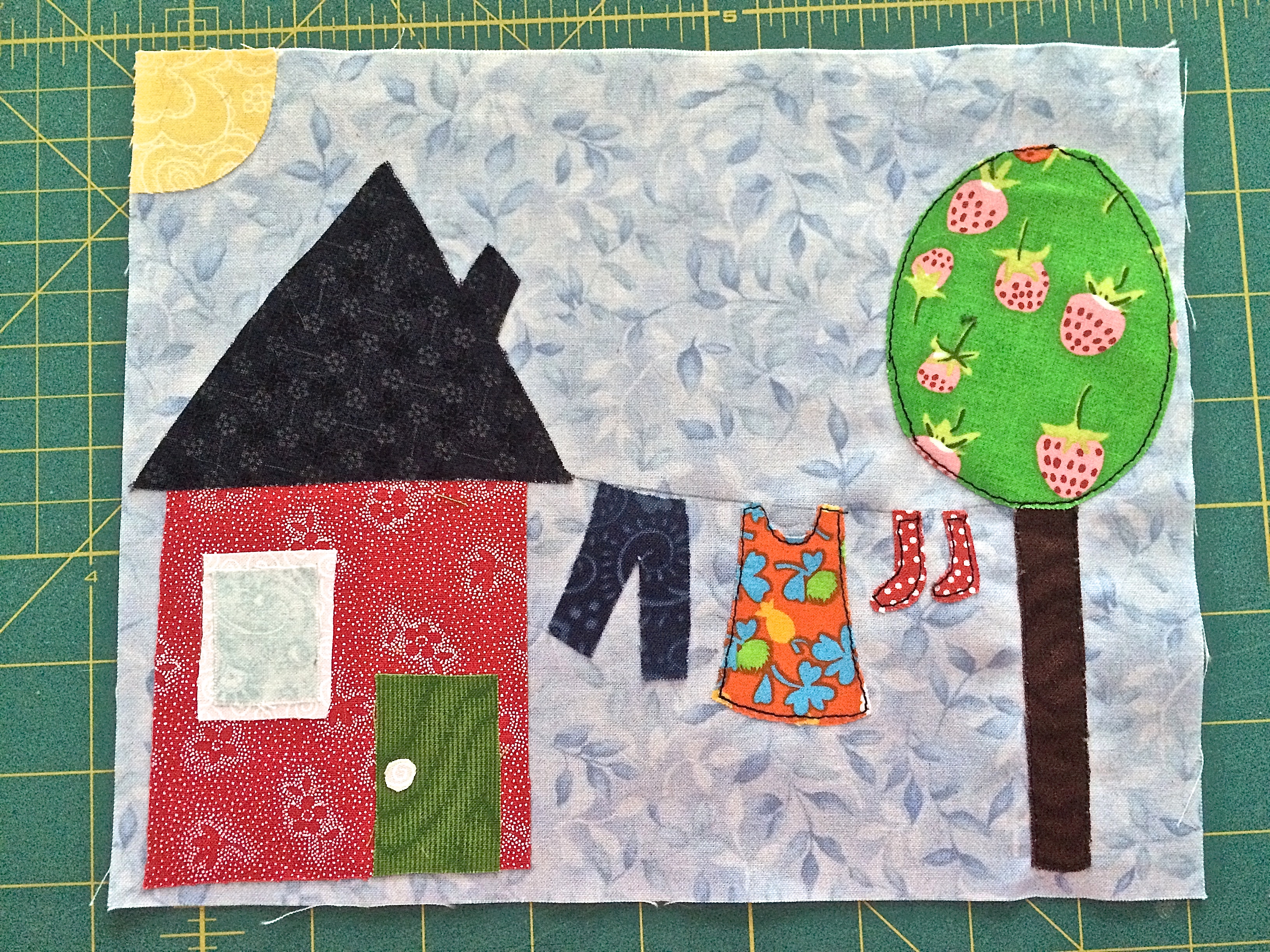I also knew right away that I would make a few changes; a white sky was out of the question. So I found a lovely, delicate tonal blue. Other fabric selections were chosen either because they suited the shapes they were to represent or because they had meaning for the two of us…fabrics we’d both collected such as the Briar Rose line by Heather Ross (used in the dress and “strawberry” tree.)