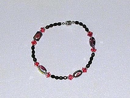 The crystals in this bracelet are Swarovski’s lovely and unique Padparadscha color. I set them off with bronze glass and some iridescent clay beads