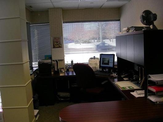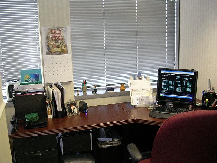 BEFORE (pictures of my unremarkable and seemingly professional office; note quilting wall calendar):
