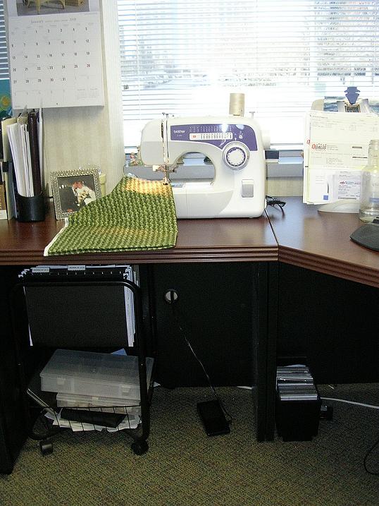 I’ve been sewing at times in my office… just working out of my portable handpiecing kit. However, at some point, I realized I wanted more options; and I knew I had the room and flexible co-workers for it to not be an issue. Only two of the ten men I work with have seen me carrying a machine into the building, but no one here as seen my full sewing station in operation. They are usually at lunch. However, the gentleman in the next office (who never goes out) must be wondering about the noises coming through the wall…