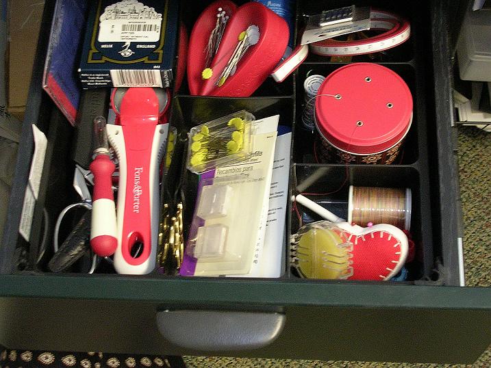 DURING (pictures of my machine set up, my tools drawer, and my cutting and pressing station – all arranged in less than 20 seconds LOL)