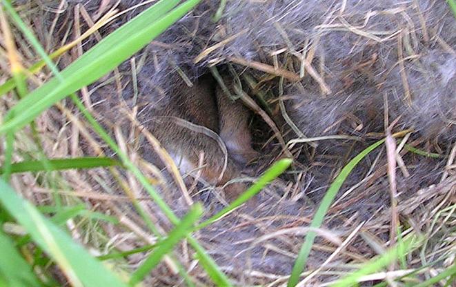 DH suggested one last peak at the baby bunnies since by the time I came home, they would have left the nest for the big wide world. The second and third pix are of a sibling of the first baby. As you can see, their eyes are now well open, except for the runt (not pictured since we wanted to get him back in the nest quickly.) The final pic is the nest opening which is completely invisible once all the dead grass is replaced. Mama comes every night to nurse and warm her babies.