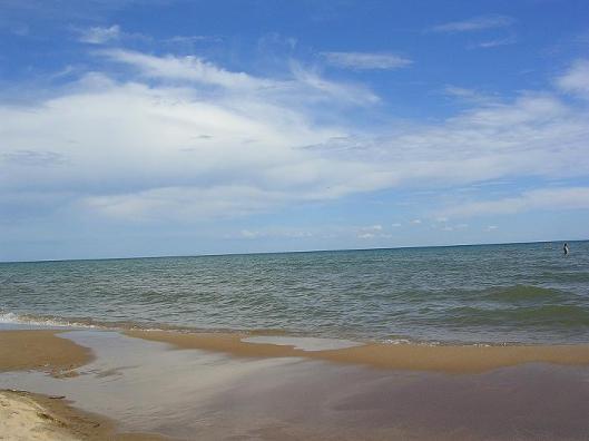 Last weekend, hubby and I drove almost three hours to one of our favorite beachs in Michigan. It is on Lake Huron which, as the world’s fifth largest lake, tends to be rather chilly. However, this beach is located in something of a bay, protected by a peninsula just south, and rolling with sandbars going out quite a ways. The average depth with this topography is shallow enough to keep the water warm and just beautiful.