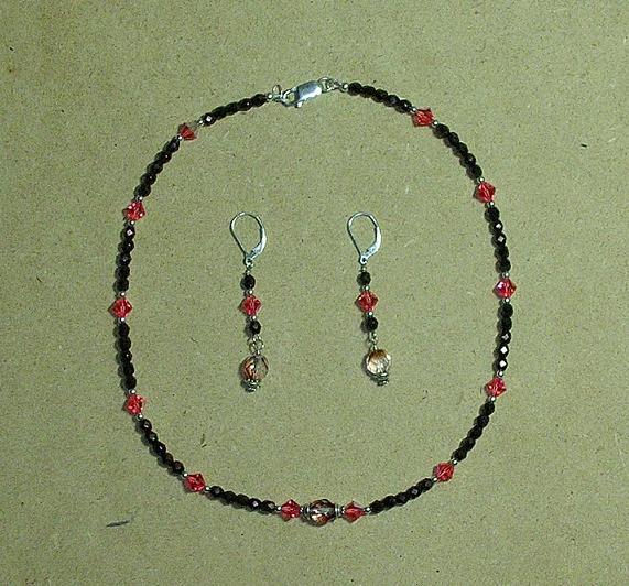 Here is the choker necklace set I made. No, my neck is not that small LOL! The earrings are rather long which worked with my hair and the outfit. More of my favorite Swarovski padparadsha crystals in this one, and while I couldn’t get the dark beads to show properly, they are a burgundy/russet glass: