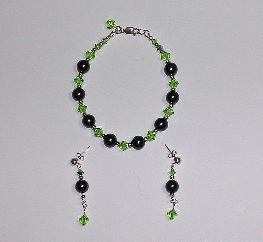 Shortly after I put my Shadow cat to sleep, my friend Peggy made me a memorial bracelet of sorts. She incorporated beads that corresponded to Shadow’s softly black fur and bright green eyes. She then kindly sent me a few extra of her materials so that I could make matching earrings. Here is the set: