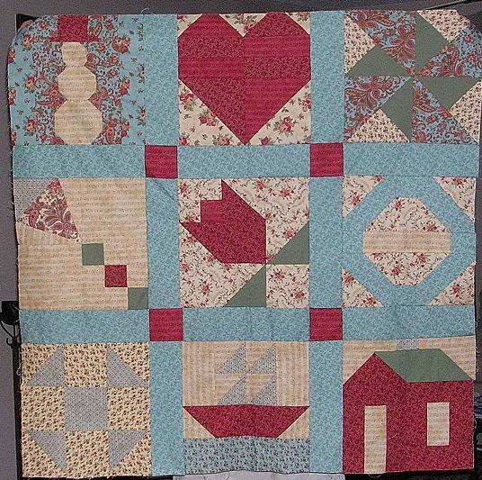 Well, here it is so far… one 12″ block for the first nine months of the year. (The snowman’s head isn’t really crooked; my hubby just has a death grip on the corner.) Blocks and sashing are handstitched. Not pictured is the block for October (a maple leaf) as well as the final row of sashing, but both are done. So, just two more blocks to assemble…