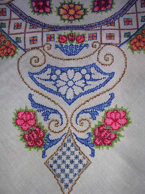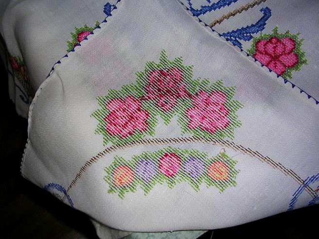 … and the Best in Show in my opinion (and hers), this amazing, perfectly cross-stitched tablecloth! It is about 48″ x 60″. I think it has every color that is in my everyday dishes. The workmanship is incredible, as you see from the reverse side. 🙂