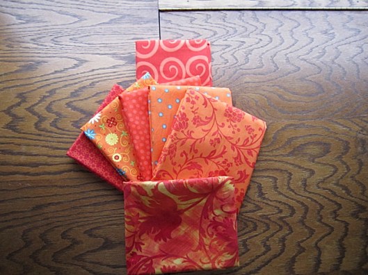 I am creating… working on my orange and white quilt. Here are a few of the latest fabrics I acquired, and I am now well set for oranges. Special thanks to Michelle for helping me out too! Those Lakehouse hydrangea fabrics are so pretty (though not pictured below)!