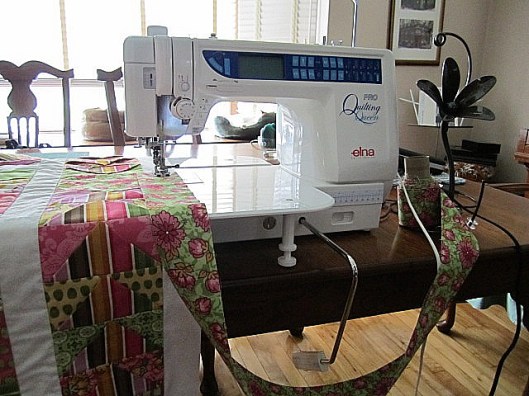 Borrowing a tip I saw a while ago on The Quilt Show, I wrapped my assembled binding around an empty TP roll and set it all on my thread cone holder. This kept things dispensing in an orderly fashion and prevented me from being strangled, or at the very least, tripped by my own 200″ binding as often happens. The cats, not having a retreating strip of fabric to chase, were understandably disinterested and for once, nowhere in sight while I was sewing.