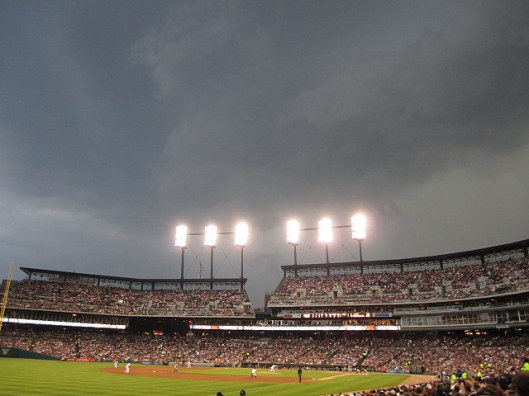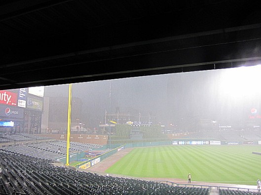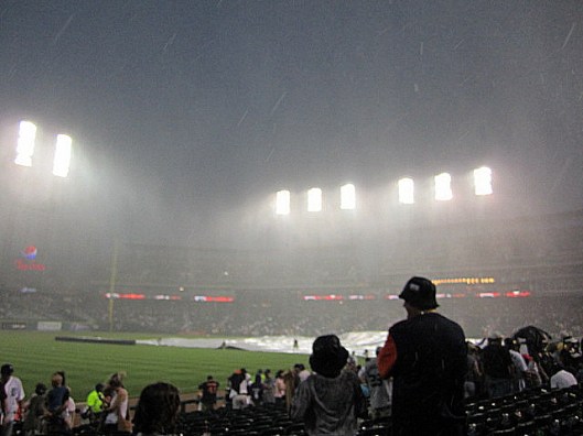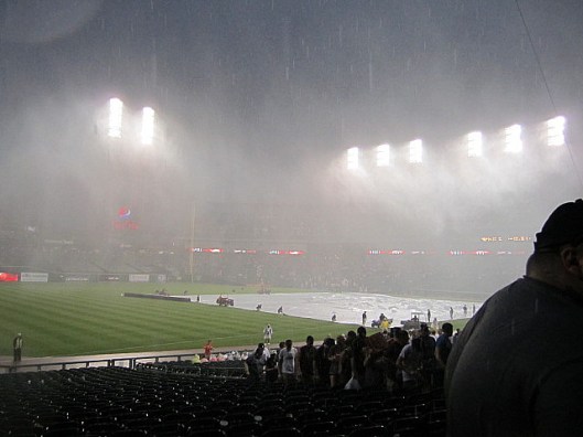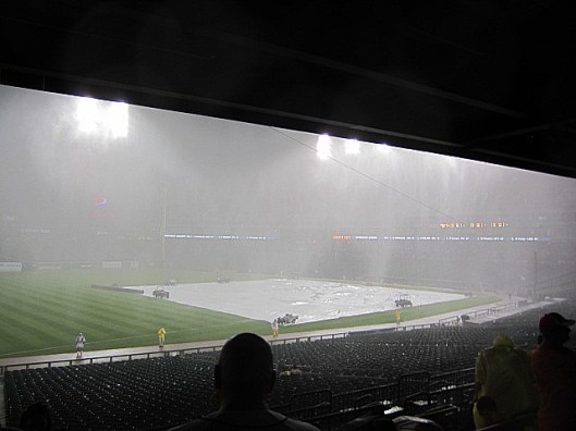 Black as night less than an hour after the game started. Toes are making squishy noises. Water is gushing down the steps like a waterfall. Poor crabby hubby is soaked from top to toe. No let-up yet in the storm, so time to leave...