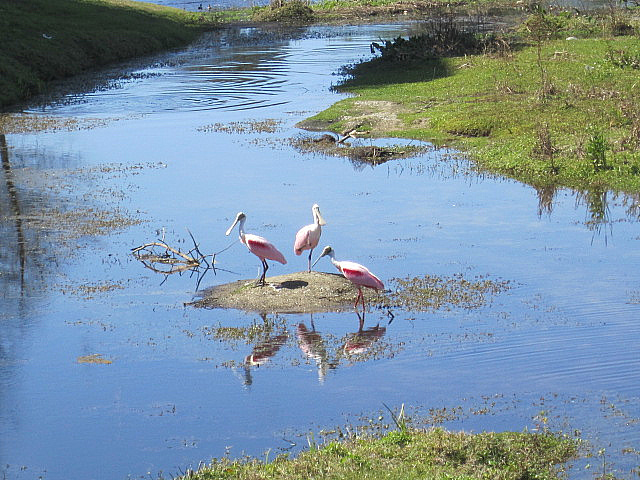 Roseate Spoonbills. Like flamingos, their "pinkness" results from pigments inherent to their diet. I used to see them in mass quantities on US-1 from the Keys to the Florida mainland, but water levels have dropped so that their habit is no longer visible from that stretch of road. 😦