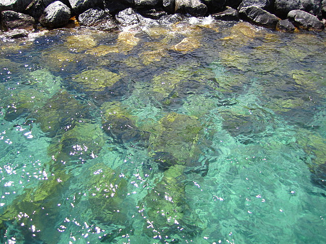 I never tire of the play of water over rocks, in this case the breakwater lining the pier, nor that amazing color…