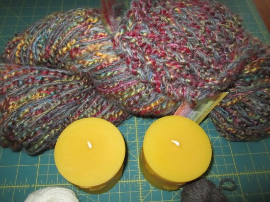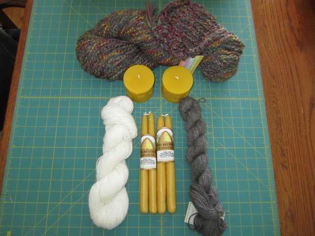 Yes, pickings were slim, but I still managed to spend money. 😉 The two smaller skeins are both alpaca, which isn’t the easiest yarn to work with, but sure feels nice! And I adore beeswax candles.
