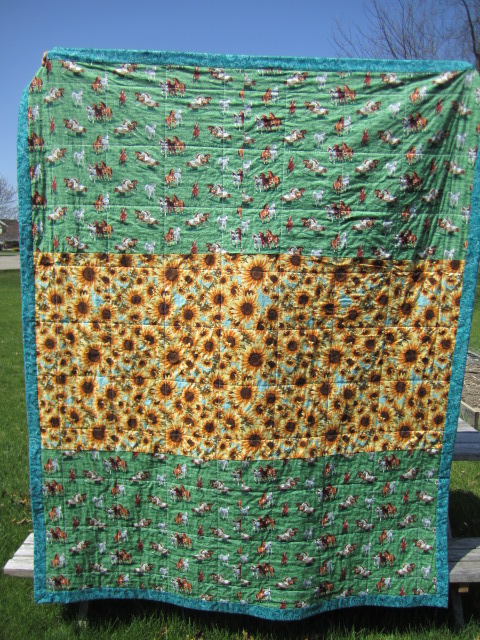My friend is making a really cool career working with horses; the theme/motif for her party was to be sunflowers.  Ergo, the backing 😉 (thank you, e-Quilter!) :