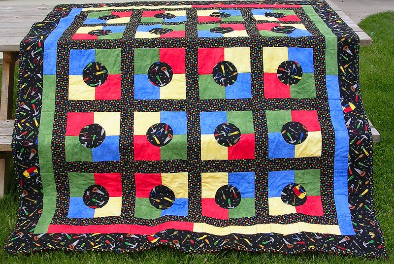 I made this quilt for my husband for our 16th anniversary. It was the first quilt I designed from scratch. Circles are appliqued onto the four-square blocks, and the tool theme on the fabrics seemed perfect for him. He adores it. (Click to enlarge to a clearer image.)