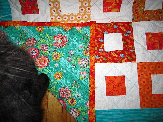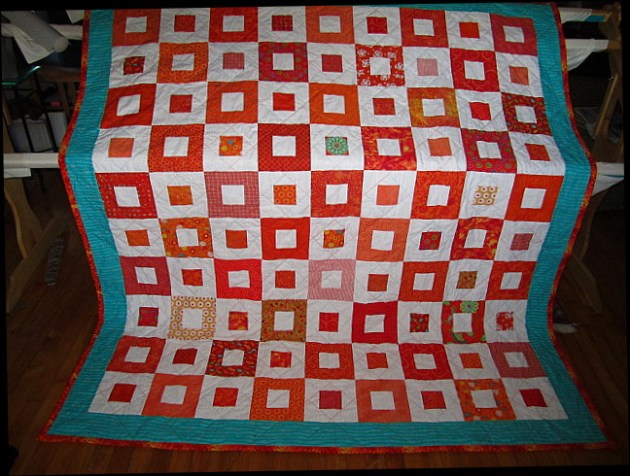 The first quilt I ever made and finished just for me. At 56″ x 56″ it is a bit short for me to nap under (though fine for sitting and watching TV with), and I have plans and fabrics to make a longer version.